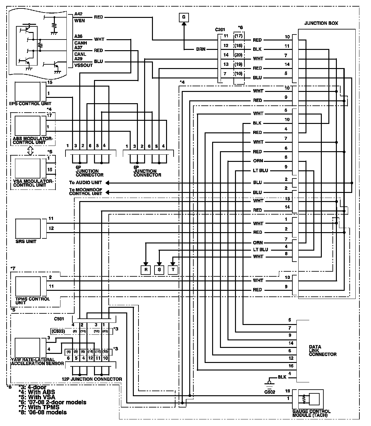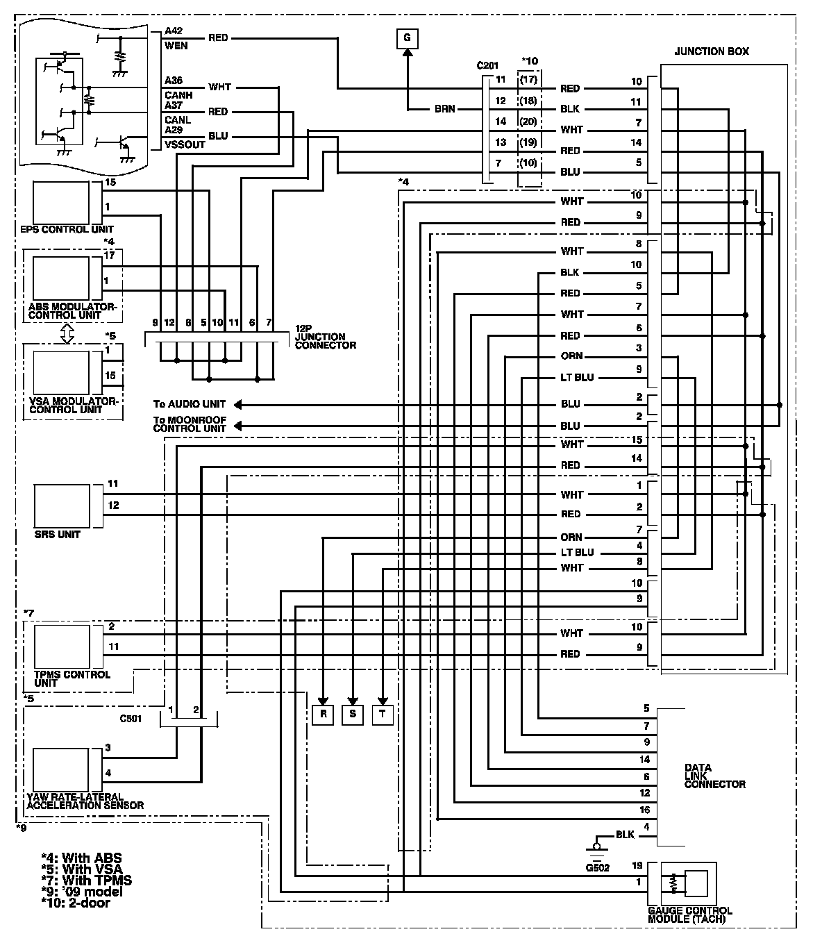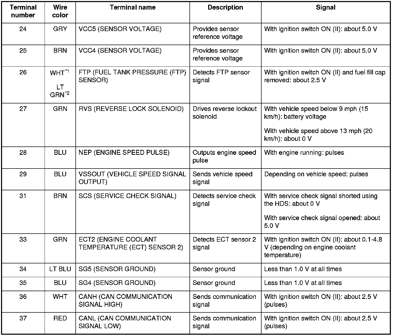 The ECM detects a failure of a signal from a sensor or another control unit and stores a Temporary DTC or a DTC. Depending on the failure, a DTC is stored in either the first or the second drive cycle (for '06 model: DTC P0457 turn on the malfunction indicator lamp (MIL) during the third drive cycle). When a DTC is stored, the ECM turns on the malfunction indicator lamp (MIL) by a signal sent to the gauge via F-CAN.
