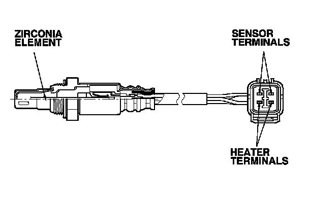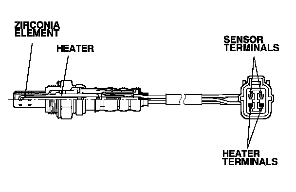 The secondary HO2S detects the oxygen content in the exhaust gas downstream of the three way catalytic converter (TWC), and sends signals to the ECM which varies the duration of fuel injection accordingly. To stabilize its output, the sensor has an internal heater. The ECM compares the HO2S output with the A/F sensor output to determine catalyst efficiency. The secondary HO2S is on the TWC.