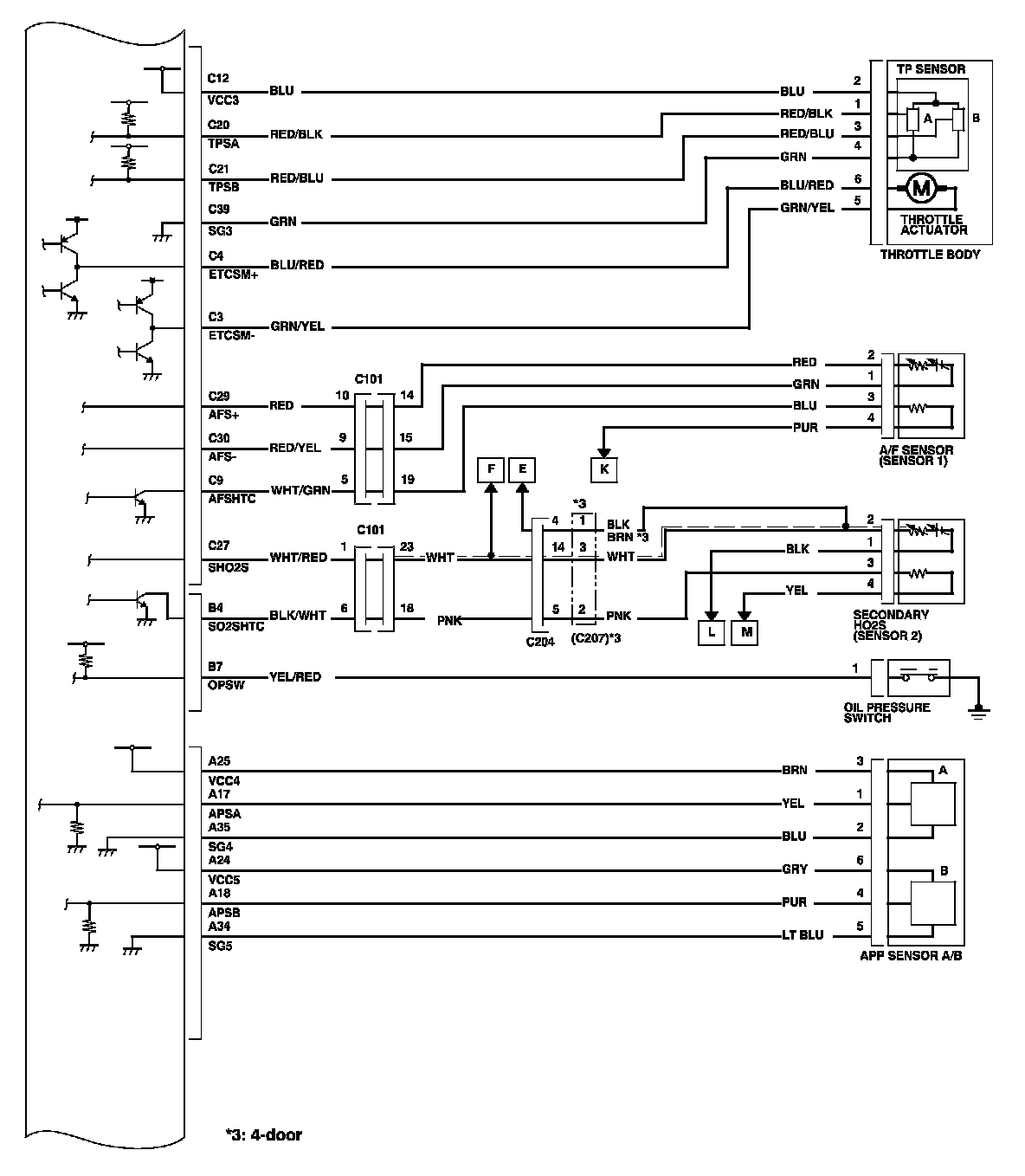 The electronic throttle control system consists of the throttle actuator, throttle position (TP) sensor A/B, accelerator pedal position (APP) sensor A/B, the electronic throttle control system (ETCS) control relay, and the ECM.