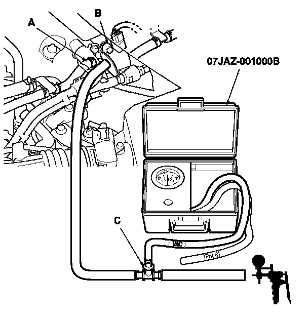 8. Disconnect the vacuum hose (A) from the EVAP canister purge valve (B) in the engine compartment, then connect a T-fitting (C) from the vacuum gauge and the vacuum pump/gauge 0-30 in.Hg to the EVAP canister purge valve as shown.