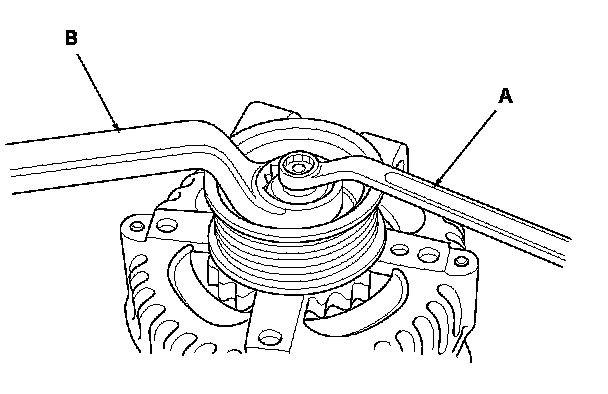 3. If the front bearing needs replacing, remove the pulley locknut with a 10 mm wrench (A) and a 22 mm wrench (B). If necessary, use an impact wrench.