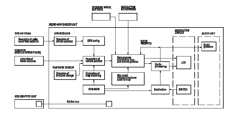 The audio-navigation unit calculates the vehicle position and guides you to the destination. The unit performs map matching correction, GPS correction, and distance tuning. It also controls the menu functions and the DVD-ROM drive, and interprets voice commands. With control of all these items, the audio-navigation unit makes the navigation picture signal, then it transmits the signal to the display panel and audio driving instructions to the audio section of the audio-navigation unit.