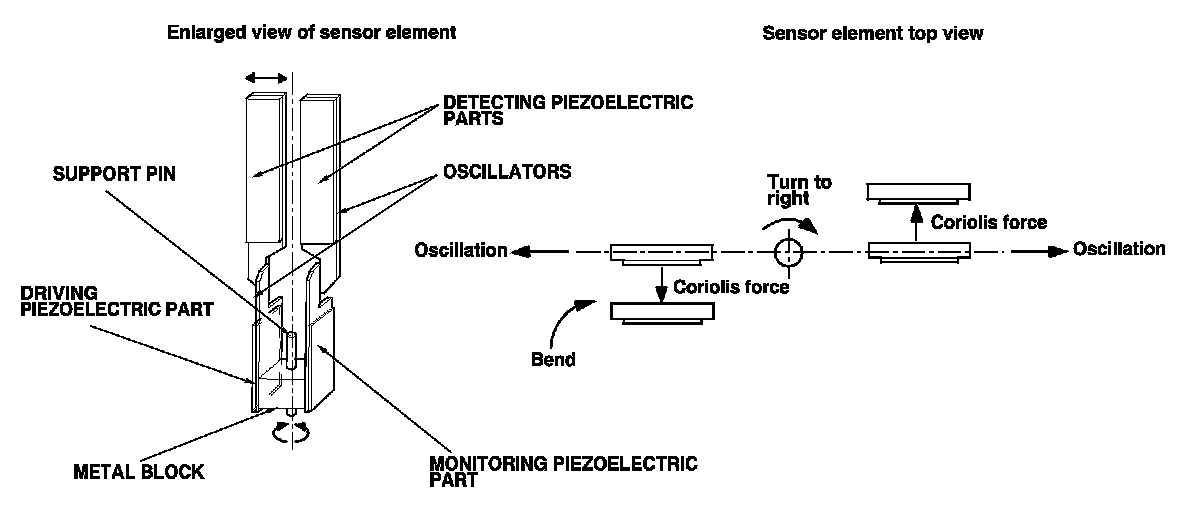 The piezoelectric parts have electric/mechanical transfer characteristics. They bend vertically when voltage is applied to both sides of the parts, and voltage is generated between both sides of the piezoelectric parts when they are bent by an external force. The oscillation gyro functions by utilizing this characteristic of the piezoelectric parts and Coriolis force. (Coriolis force deflects moving objects as a result of the earth's rotation.) In the oscillation gyro, this force moves the sensor element when angular velocity is applied.