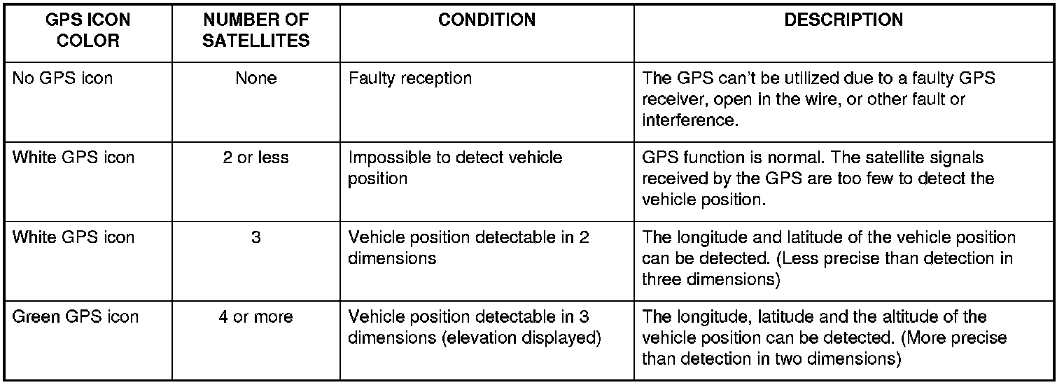 The navigation system receives signals from the global positioning system (GPS), a network of 24 satellites in orbit around the earth. By receiving signals from several of these satellites, the navigation system can determine the latitude, longitude, and elevation of the vehicle. In addition, signals from the system's yaw rate sensor and the ECM/PCM (vehicle speed pulse) enable the system to keep track of the vehicle's direction and speed of travel.