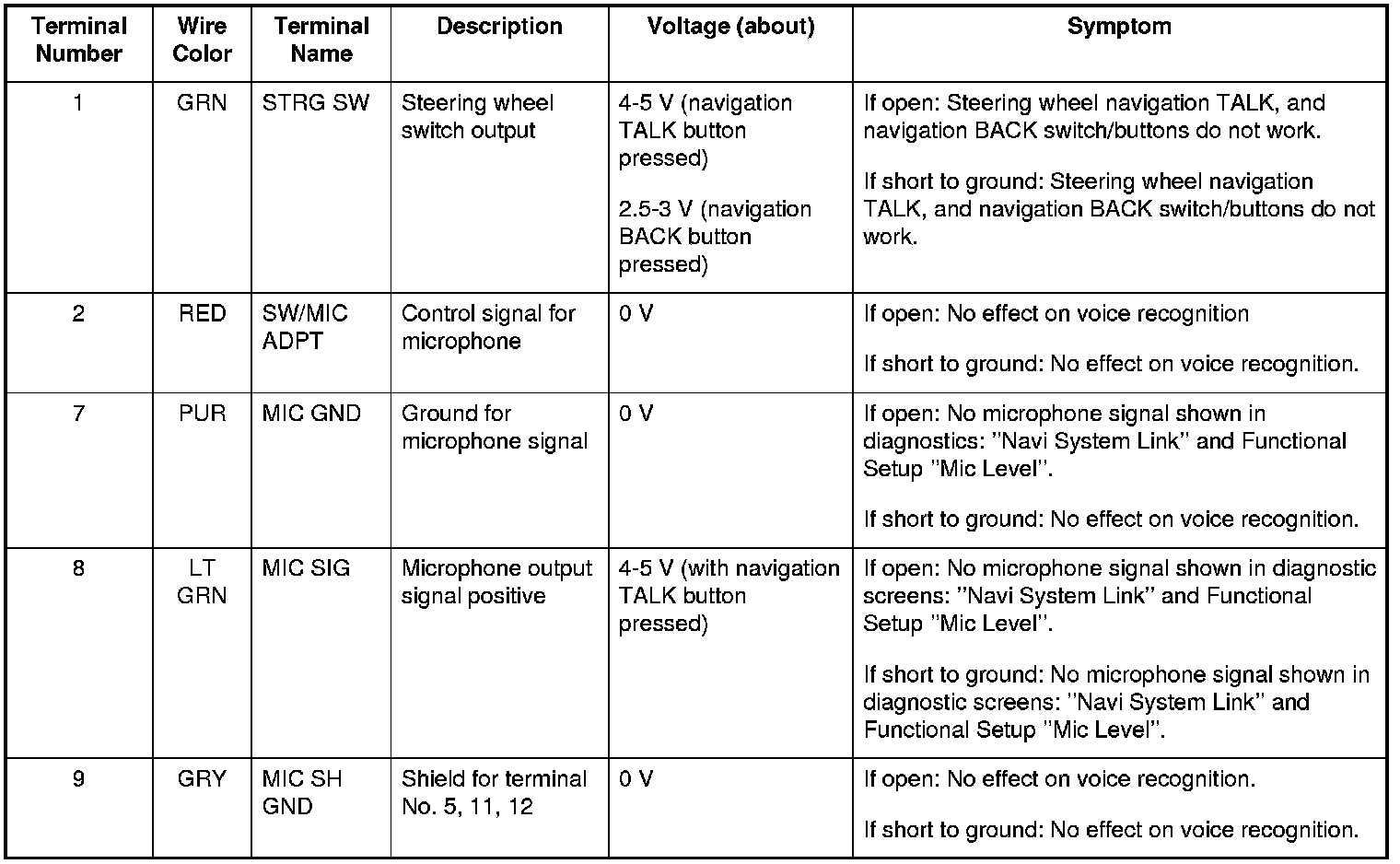 The navigation system is composed of the audio-navigation unit, the ECM/PCM (vehicle speed signal), the GPS antenna, the microphone, and the voice control switch.