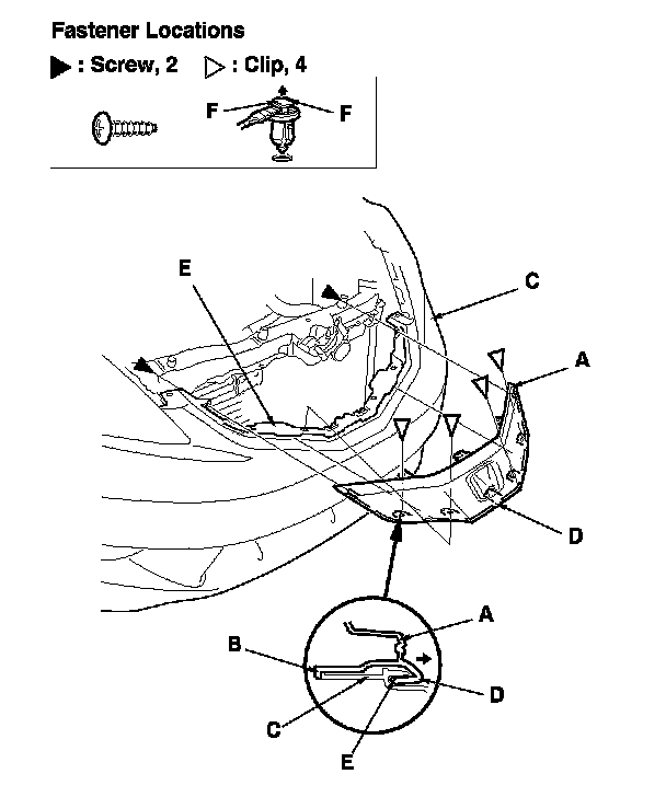 -2 Release the hooks (B) on the grille from the front bumper (C), and pull the grille out to release the ribs (D) from the front bumper groove (E).