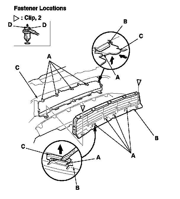 2. Remove the clips, and release the hooks (A), then remove the lower front bumper grille (B) from the front bumper (C).