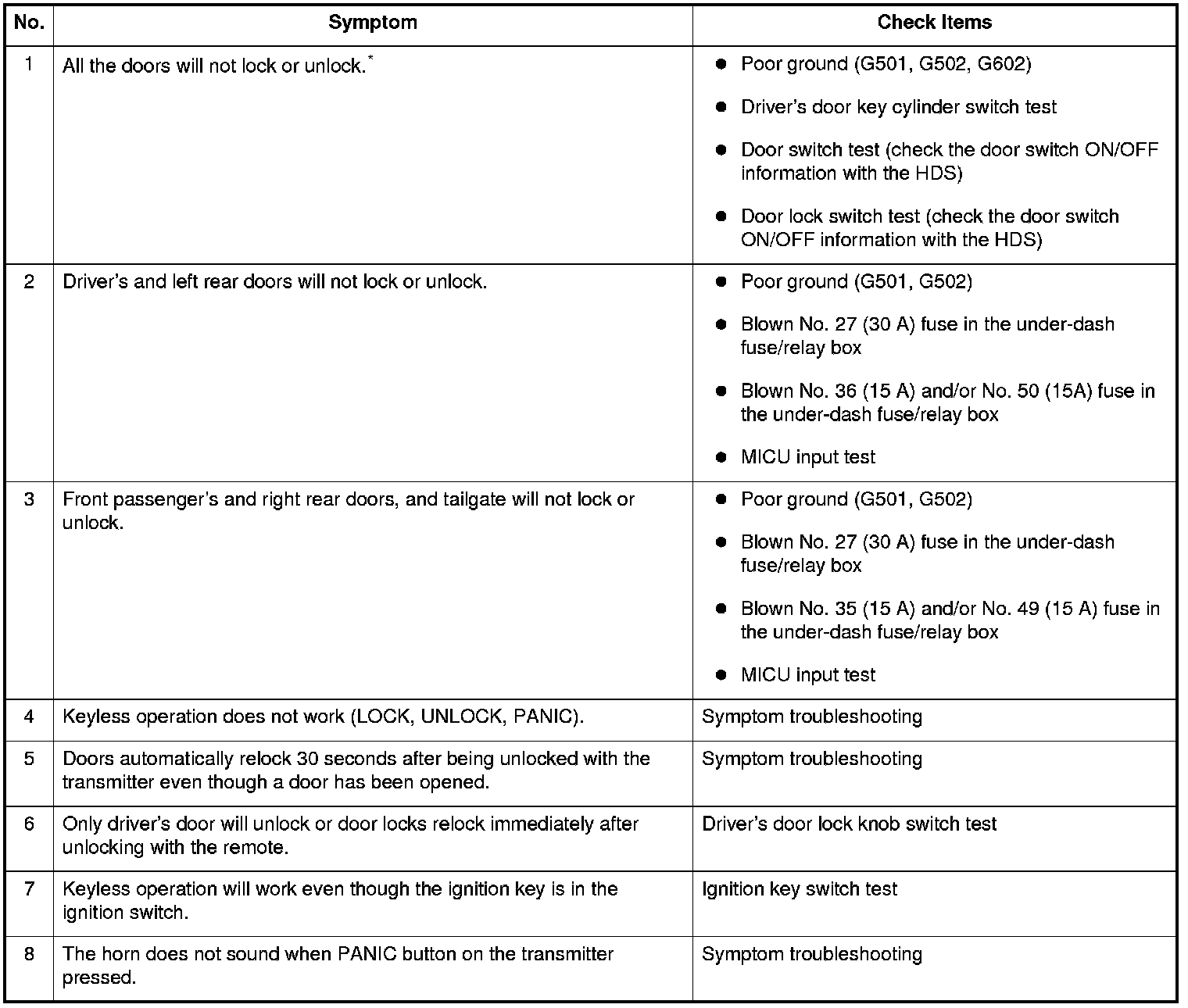 *: If only one door is not working properly, check that door's lock actuator first, then check the other items listed in this table.