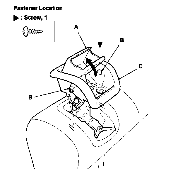 2. Release the hooks (B), and pull up the latch cover (C) from the rear seat-back.