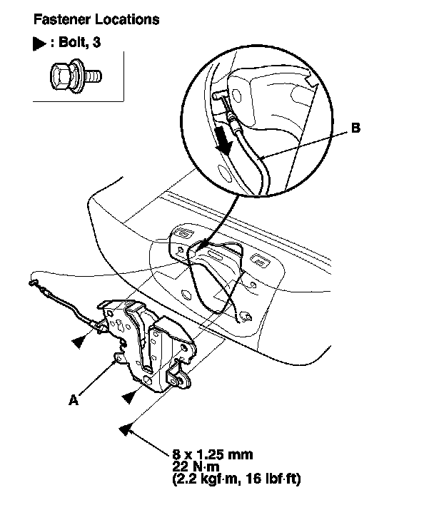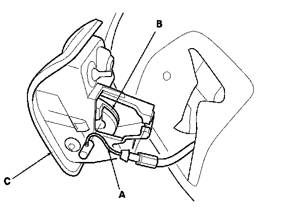 3. Disconnect the control cable (A) from the latch lever (B), and remove the latch cover (C). Take care not to bend the cable.