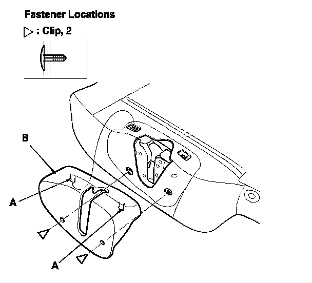 4. Detach the clips and the hooks (A), then remove the striker hole cover (B).