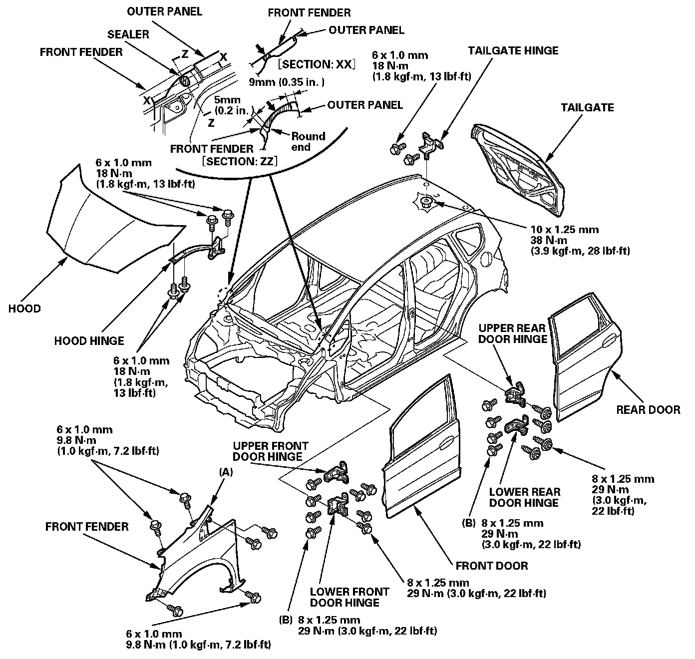 - Apply spot sealer to the mating surface, then install the front fender, the hood, the doors, the tailgate, and the hinges.