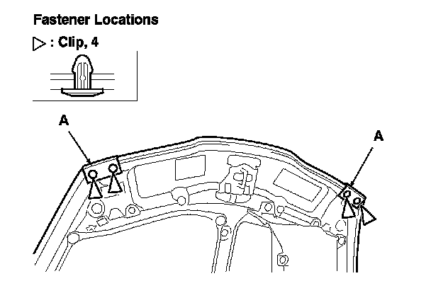 1. Detach the clips with a clip remover, then remove the hood seals (A). Take care not to scratch the hood.