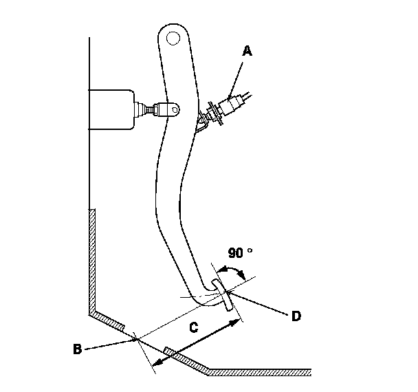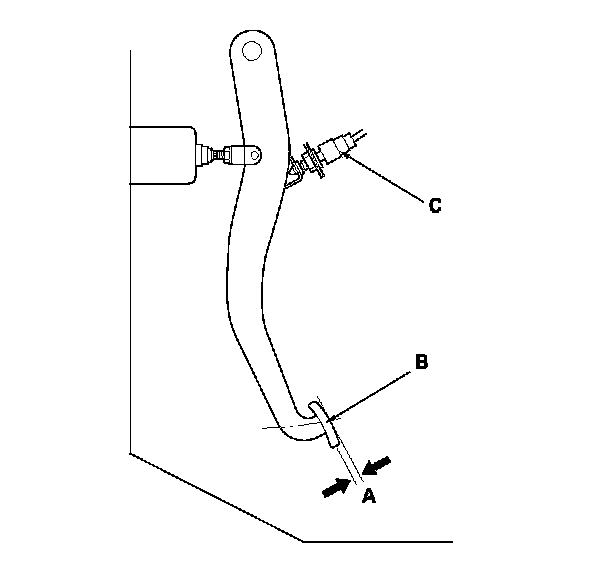 1. With the ignition switch in LOCK (0), inspect the play (A) at the brake pedal pad (B) by pushing the brake pedal by hand. If the brake pedal free play is out of specification, adjust the brake pedal position switch (C). If the brake pedal free play is insufficient, it may result in brake drag.