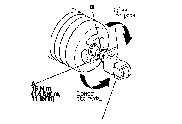 4. Loosen the pushrod locknut (A), and screw the pushrod (B) in or out with pliers until the standard pedal height from the floor is reached. After adjustment, tighten the locknut firmly. Do not adjust the pedal height with the pushrod pressed.