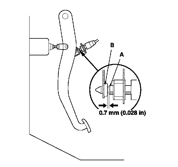 5. Lift up on the brake pedal by hand. Push in the brake pedal position switch until its plunger is fully pressed (threaded end (A) touching the pad (B) on the pedal arm). Turn the switch 45 ° clockwise to lock it. The gap between the brake pedal position switch and the pad is automatically adjusted to 0.7 mm (0.028 in.) by locking the switch. Make sure the brake lights go off when the pedal is released.