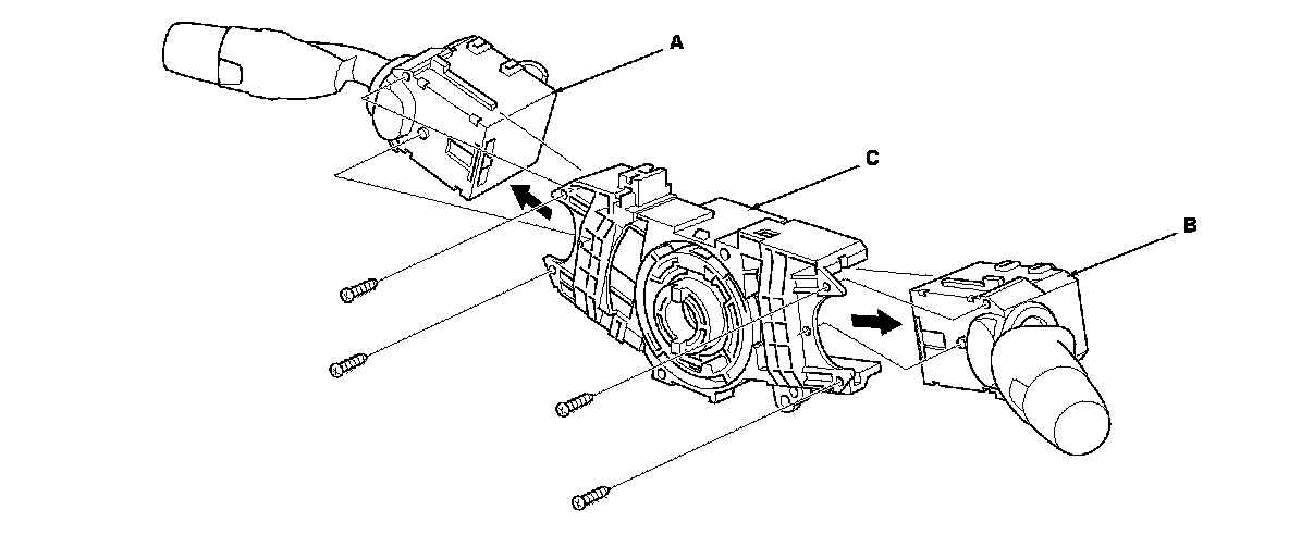 4. Remove the combination light switch (A) and the wiper/washer switch (B) from the combination switch body assembly (C).