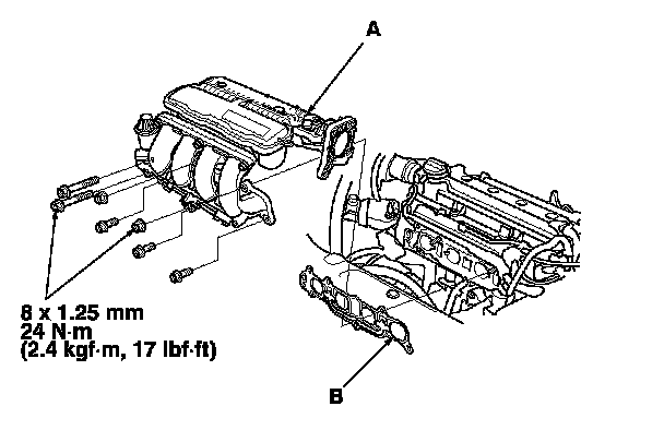 1. Install the intake manifold/chamber assembly (A) with a new gasket (B), and tighten the bolts and nuts in a crisscross pattern in three steps, beginning with the inner bolt.