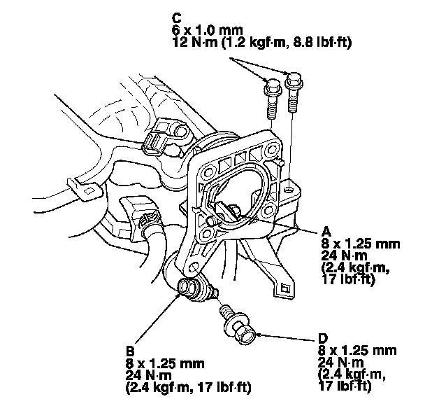 2. Loosen the intake manifold bracket mounting bolt (A), (B). Tighten the mounting bolts (C), then tighten the mounting bolt (A). Loosely tighten the mounting bolt (D), and tighten the mounting bolt (B), then tighten the mounting bolt (D).