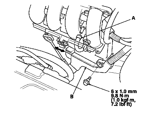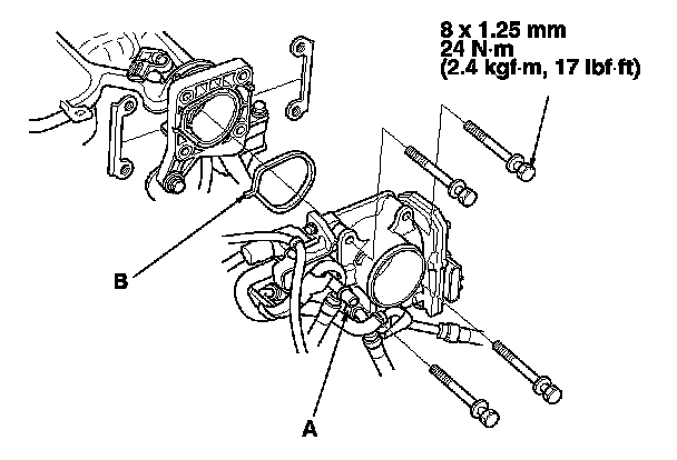 3. Install the throttle body (A) with new gasket (B).