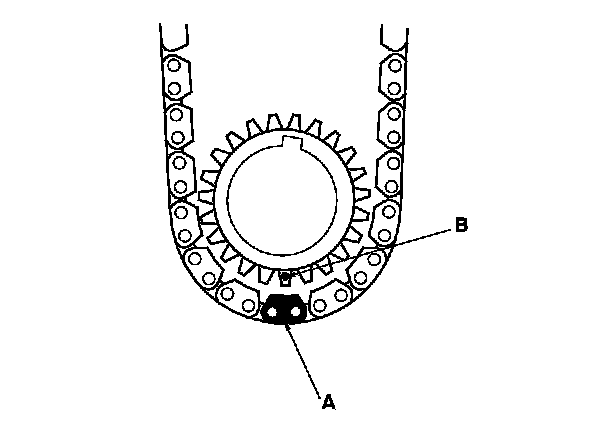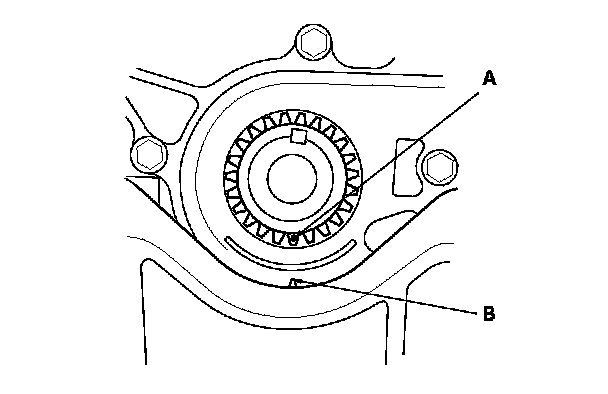 1. Set the crankshaft to top dead center (TDC). Align the TDC mark (A) on the crankshaft sprocket with the pointer (B) on the oil pump.