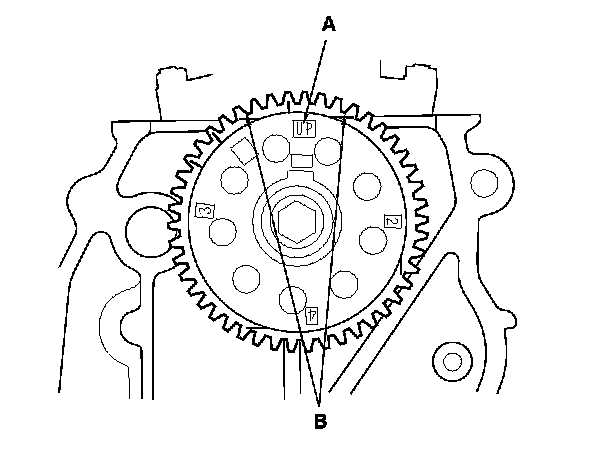 3. Set the camshaft to TDC. The "UP" mark (A) on the camshaft sprocket should be at the top, and the TDC grooves (B) on the camshaft sprocket should line up with the top edge of the head.