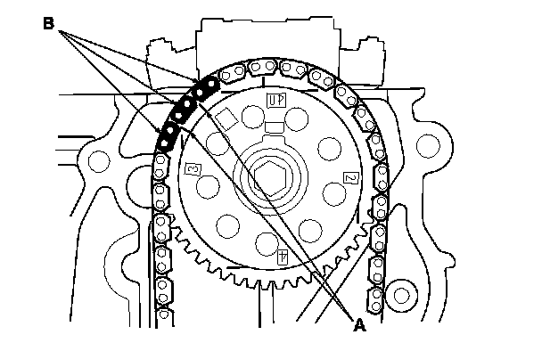 5. Install the cam chain on the camshaft sprocket with the pointers (A) aligned with the three colored pieces (B) as shown.