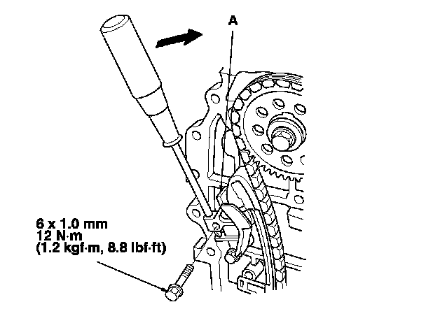 9. Rotate the cam chain tensioner slider clockwise to compress the cam chain tensioner, and install the remaining bolt, then tighten the bolts.