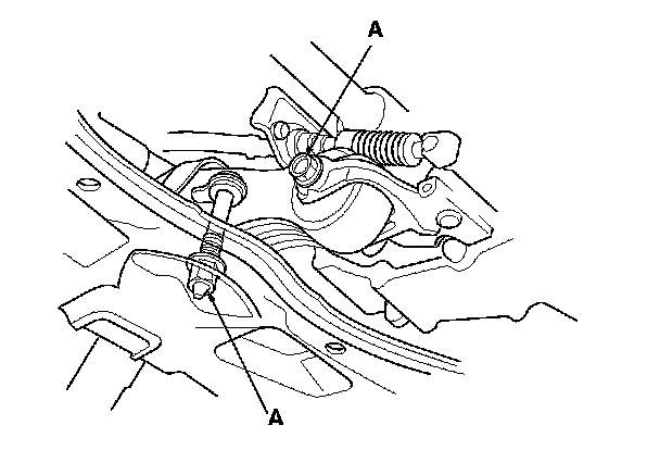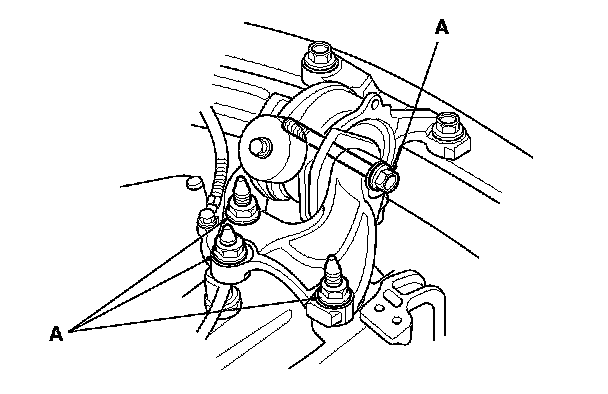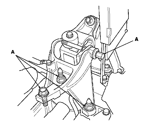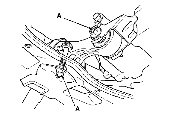 21. Loosen the transmission mount bracket mounting bolts and nuts (A).