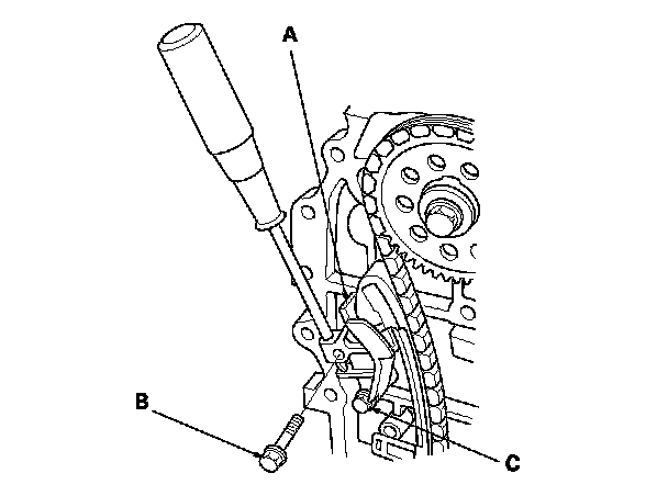 15. Hold the cam chain tensioner slider with the screwdriver, then remove the bolt (B), and loosen the bolt (C).