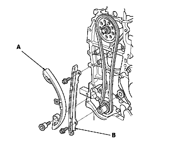 17. Remove the cam chain tensioner (A) and the cam chain guide (B).