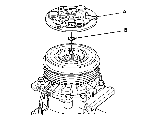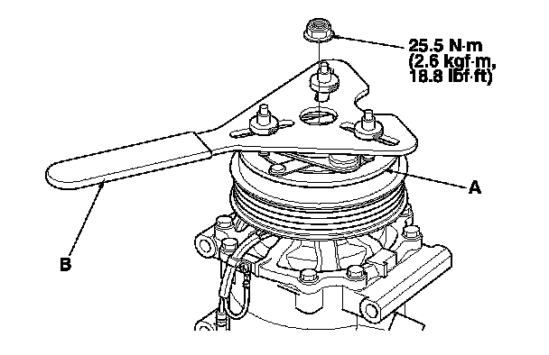 1. Remove the center nut while holding the armature plate (A) with a commercially available A/C clutch holder (B).