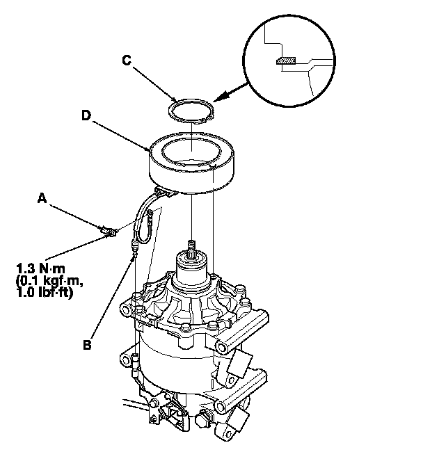 4. Remove the bolt and the holder (A), then disconnect the field coil connector (B). Remove the snap ring (C) with snap ring pliers, then remove the field coil (D). Be careful not to damage the field coil or the A/C compressor.