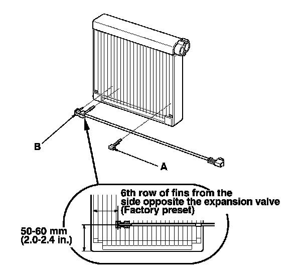NOTE: At the factory, the evaporator temperature sensor is installed at the 6th row of fins from the side opposite of the expansion valve.