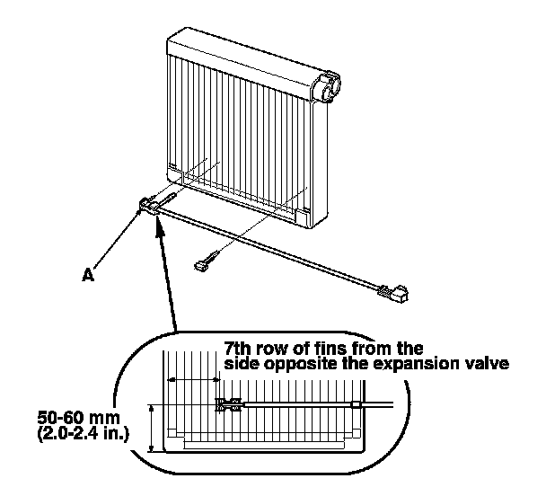 9. Reinstall the evaporator temperature sensor. If the evaporator is new, install the sensor on the 6th row of fins, counting from the side opposite the expansion valve. If you are reinstalling the old evaporator, install the sensor on the 7th row of fins.