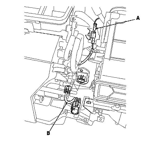 7. Disconnect the connector (A) from the evaporator sensor, and remove the blower resistor wire harness (B).