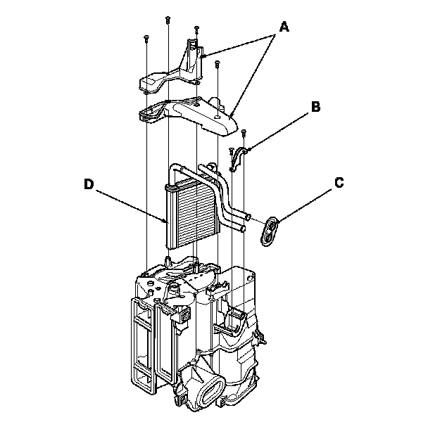 10. Remove the holder (B) and the grommet (C), then carefully pull out the heater core (D).