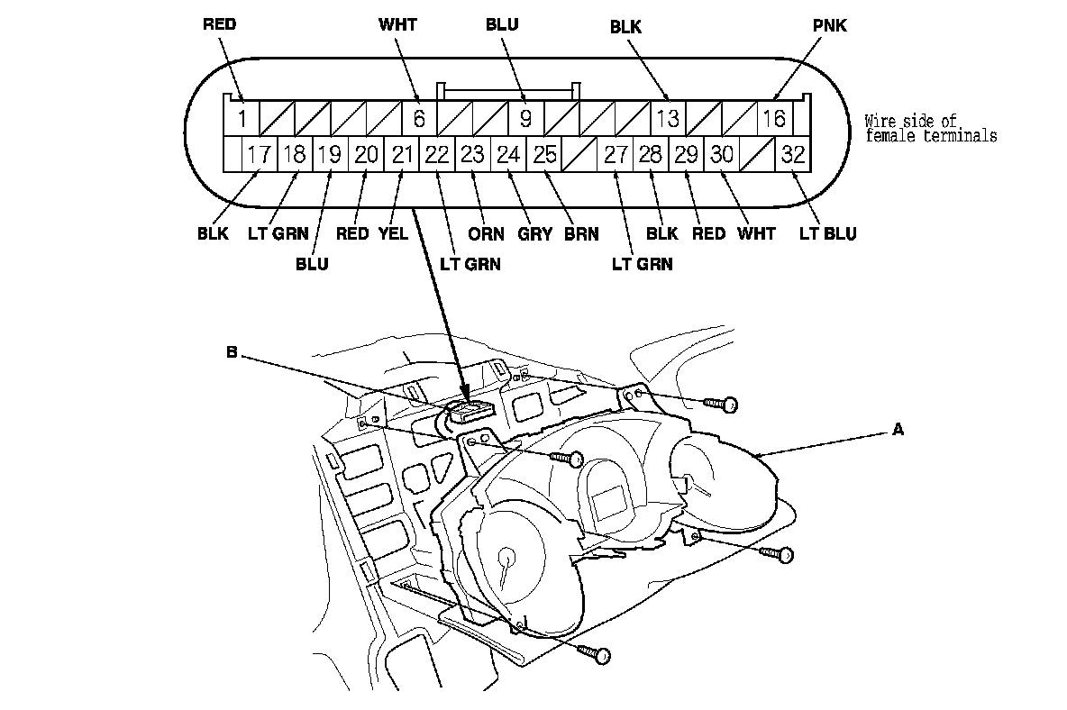 2. Remove the gauge control module (A), Service and Repair and disconnect the 32P connector (B) from it.