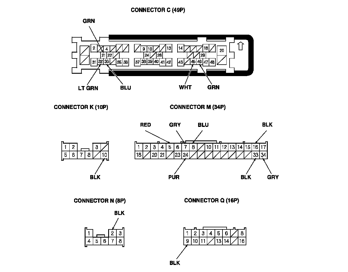 3. Disconnect under-dash fuse/relay box connectors C, K, M, N, and Q.