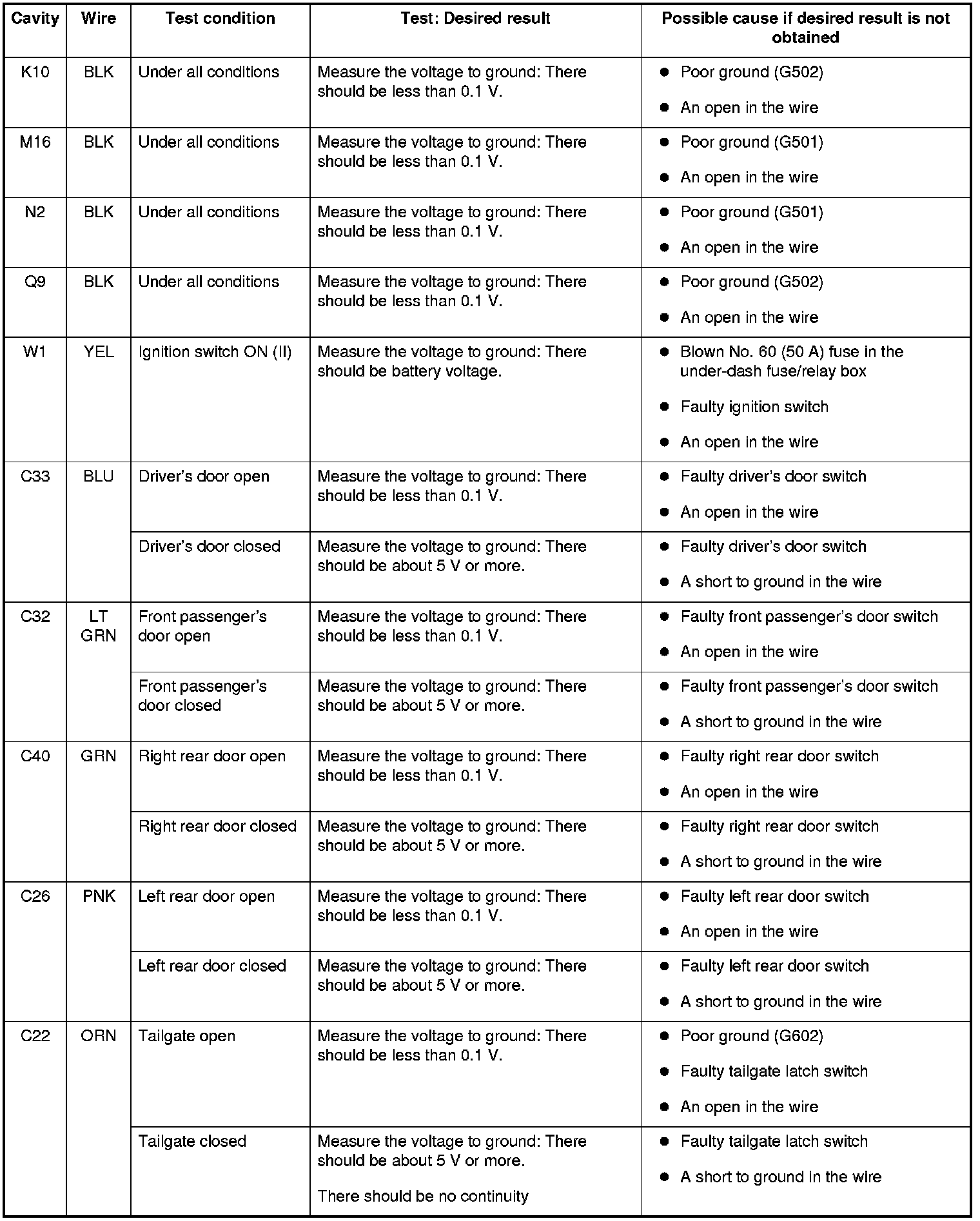 5. Reconnect the connectors to the under-dash fuse/relay box, and do these input tests at the following connectors.
