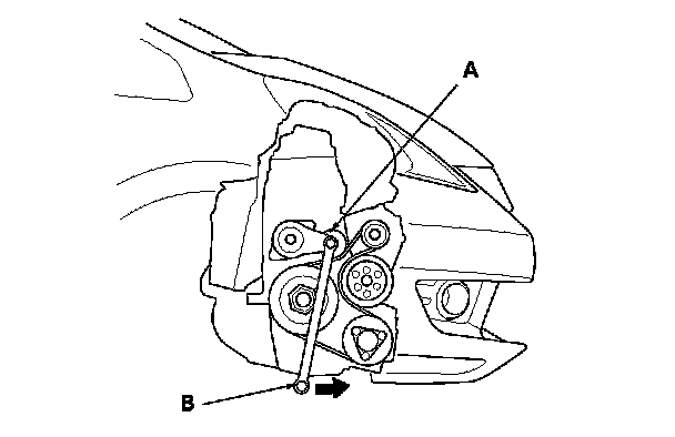 2. Move the tensioner (A) with a wrench (B) in the direction shown to relieve tension from the drive belt, then remove the drive belt.