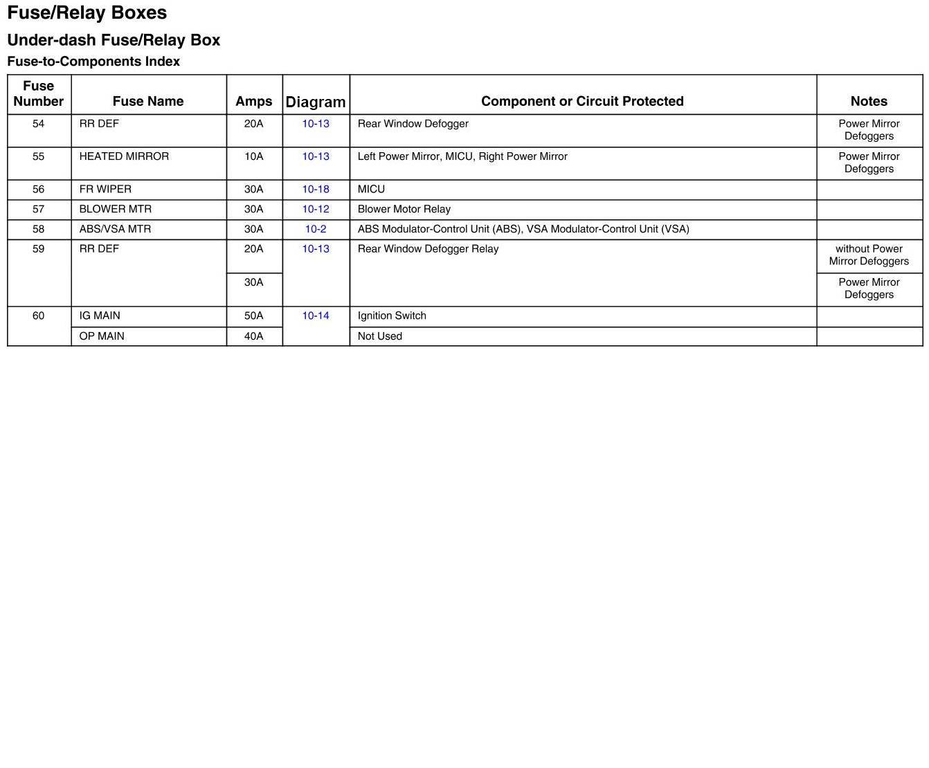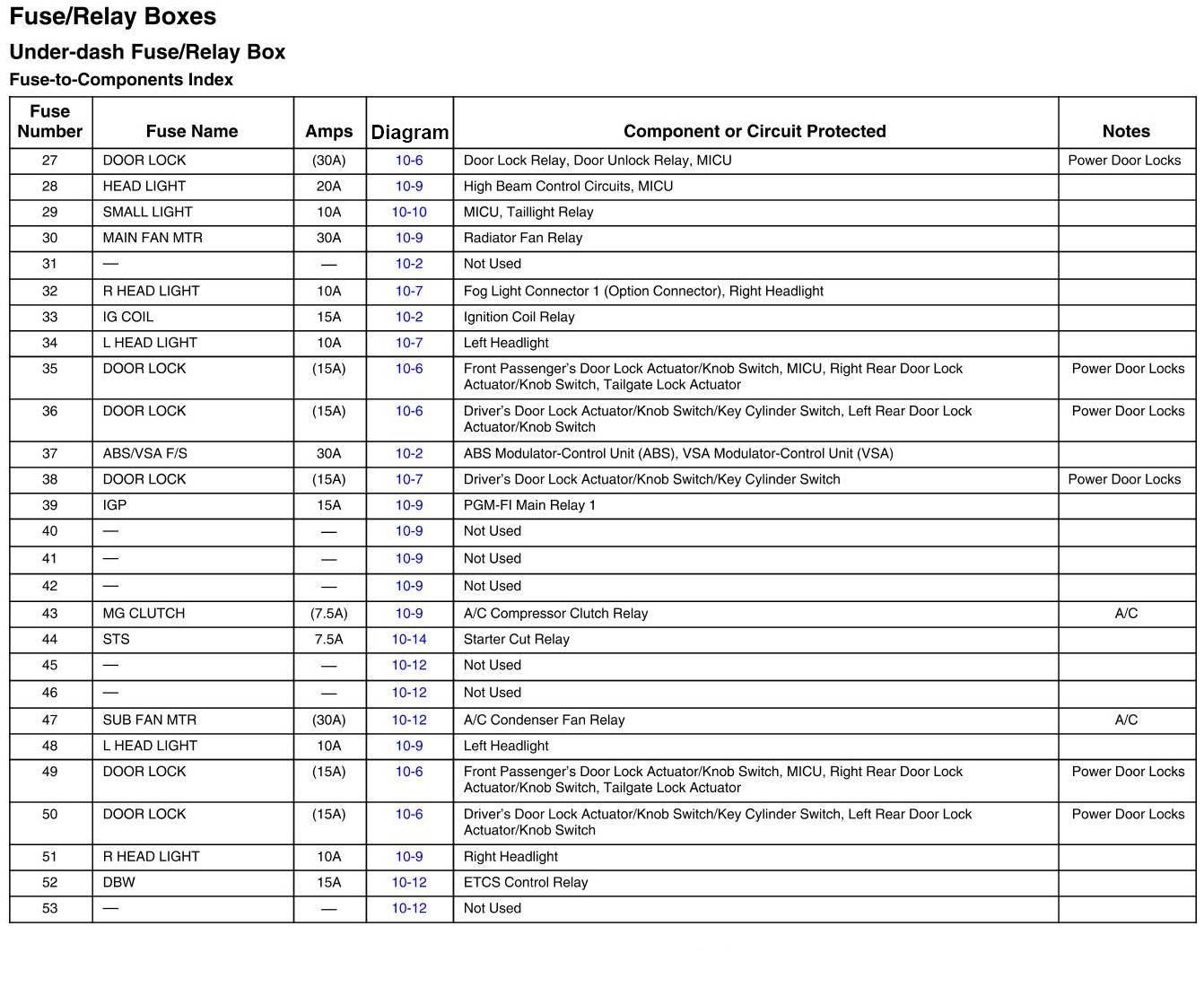 Under-dash Fuse/Relay Box - Fuse-to-Components Index