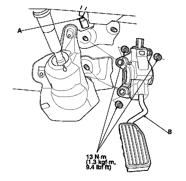 3. Remove the accelerator pedal module (B).