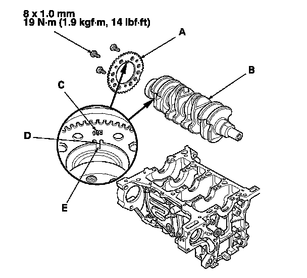 3. Install the CKP pulse plate on the crankshaft (B): face the marked side (C) away from the crankshaft, and align the tab (D) on the CKP pulse plate with the groove (E) on the crankshaft.