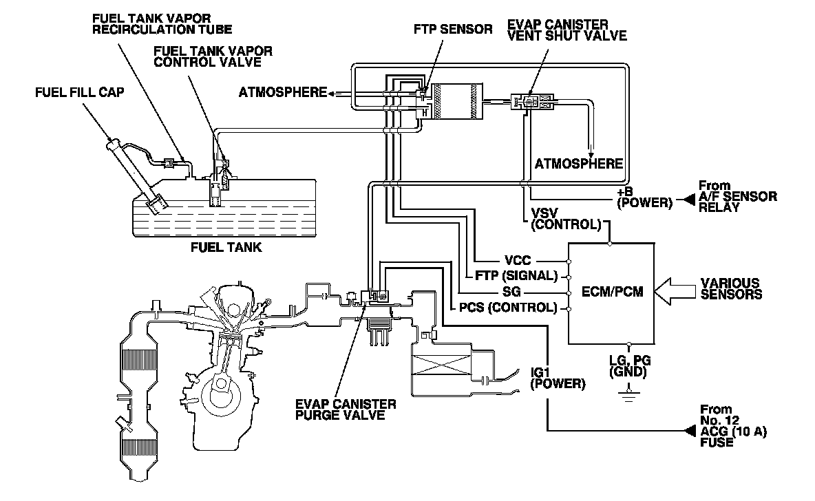 The EVAP controls minimize the amount of fuel vapor escaping to the atmosphere. Vapor from the fuel tank is temporarily stored in the EVAP canister until it can be purged from the canister into the engine and burned.