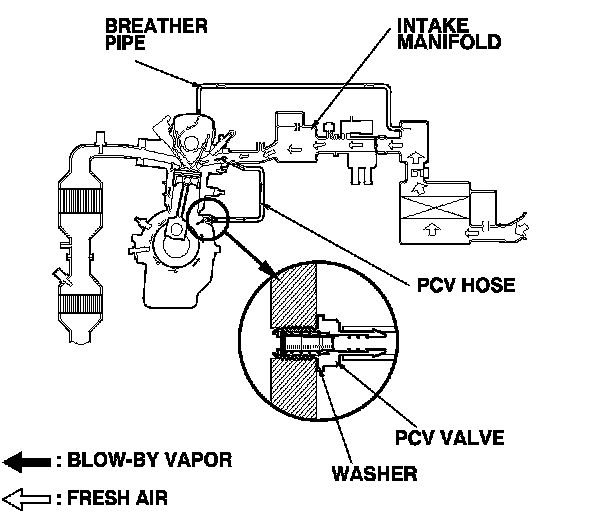 The PCV valve prevents blow-by gasses from escaping into the atmosphere by venting them into the intake manifold.