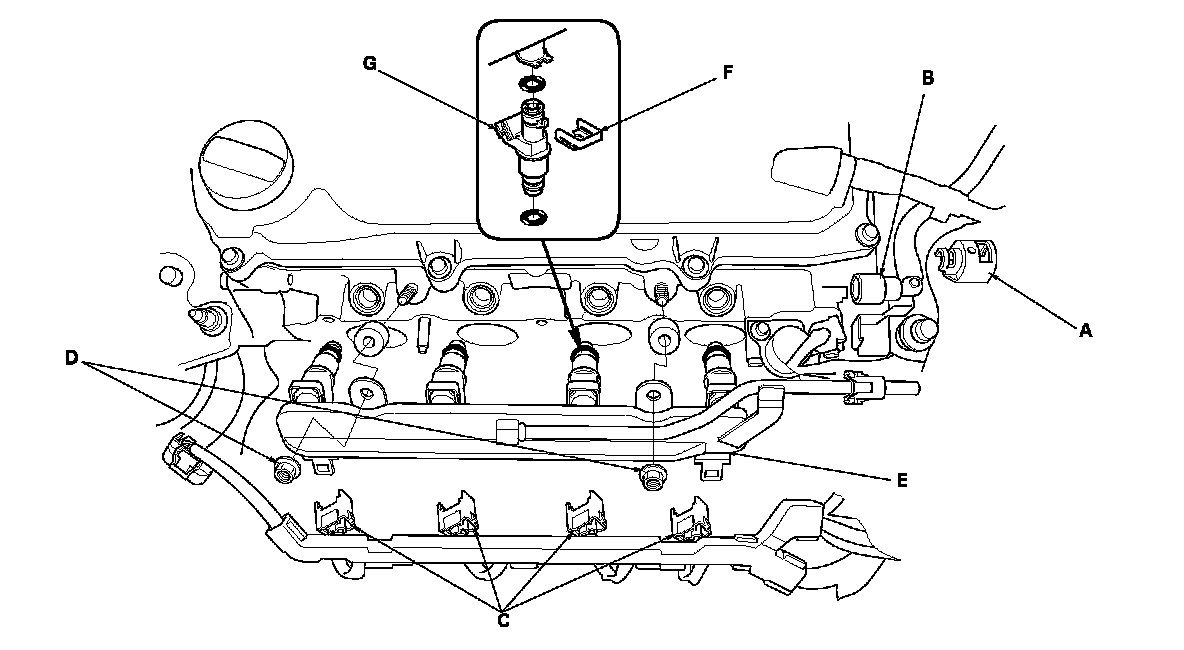 8. Remove the injectors (G) from the fuel rail.