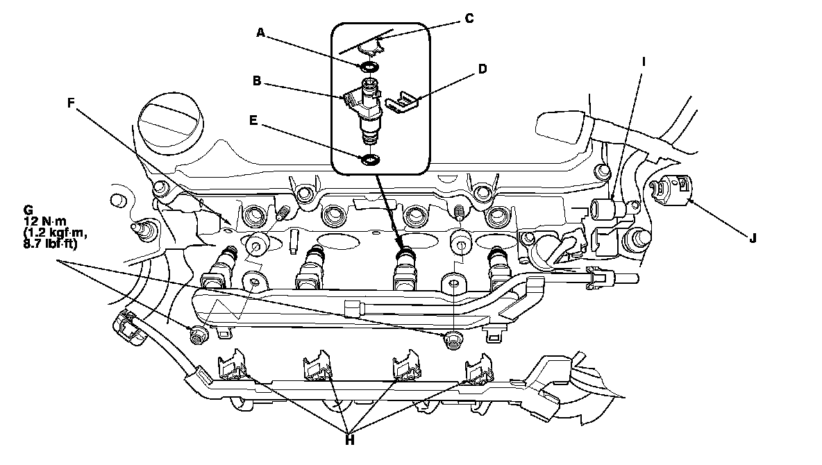 13. Install the fuel rail mounting nuts (G).
