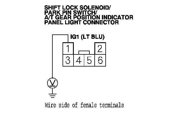 10. Measure the voltage between shift lock solenoid/park pin switch/A/T gear position indicator panel light connector terminal No. 1 and body ground.