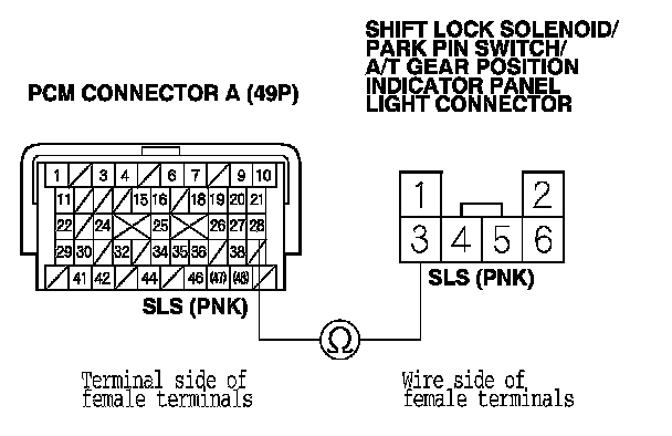 NOTE: Do not connect the positive battery terminal to the connector terminal No. 3 or you will damage the diode inside the shift lock solenoid.